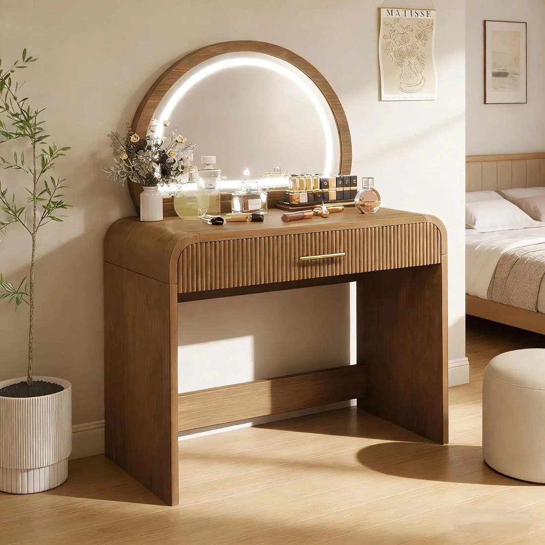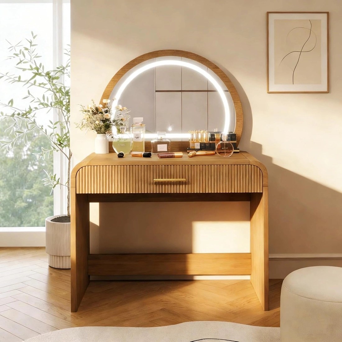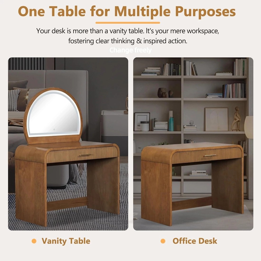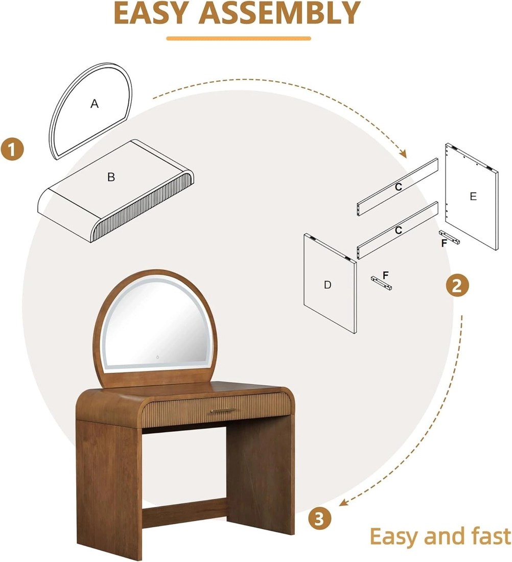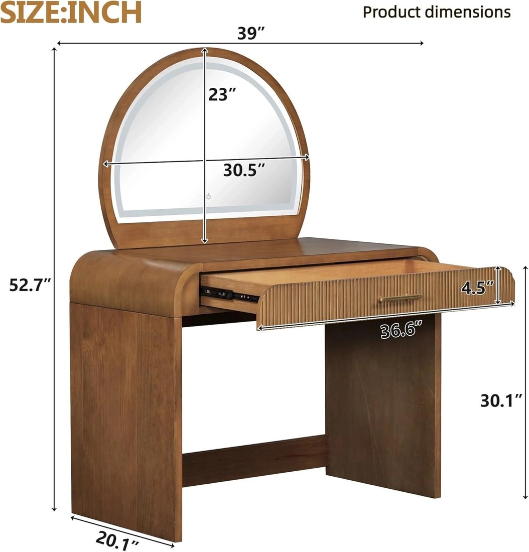 Turn busy mornings into effortless rituals with a 36-inch espresso vanity console that doubles as a stylish dressing desk and a bright makeup mirror. This space-saving setup brings a dedicated beauty zone to any bedroom or dressing area, helping you look polished with less mess and more ease. The curved edges and wave-pattern drawers blend classic elegance with practical safety, while the rich espresso finish adds warmth to contemporary or traditional decor sets. It looks sophisticated, and it’s built to handle daily use without compromising style. HD lighted makeup mirror with a touchscreen delivers ideal illumination for flawless results. Explore three lighting modes to tailor brightness and color temperature—from daylight precision to evening glam—with a simple long-press to switch modes. * 36-inch vanity desk with ample storage — multiple drawers keep cosmetics, jewelry, and beauty essentials neatly organized and within arm’s reach. * Detachable mirror for desk versatility — easily convert to a compact workspace when you need a surface for writing or tasks beyond makeup. * Durable rubber wood construction in espresso — sturdy, long-lasting, and timeless in any room. * Quick 20-minute assembly — clear, step-by-step instructions get you set up fast with minimal hassle. Designed for bedrooms, dressing rooms, and small spaces, this 2-in-1 vanity console elevates your daily routine while keeping clutter at bay. It’s a thoughtful gift for birthdays, Valentine’s Day, or Mother’s Day—bringing joy, organization, and a touch of luxury to someone you love.
