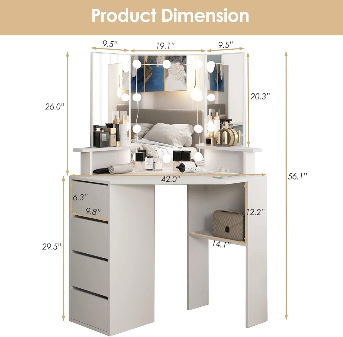 Wake up your daily routine with a space-smart vanity that lights you up from every angle. This White Corner Vanity Desk, a 42-inch wide centerpiece, combines practical charging, brilliant illumination, and organized storage to elevate your makeup ritual in any bedroom or bathroom. * Built-in charge station for a clutter-free space: A dedicated power strip with 2 outlets and 2 USB ports powers LED lights, hair tools, and devices from a single, tidy hub. Includes a 4.9-foot power cord for flexible placement. * Tri-fold illuminated mirror for all angles: A three-panel mirror with 10 LED bulbs lets you view yourself from multiple angles while applying makeup or styling hair, ensuring precise results. * Three lighting modes with adjustable brightness: Choose from cool white, warm white, or warm yellow, and fine-tune brightness to match daylight, evening, or professional vanity needs. * Ample storage to stay organized: Two shelves, four drawers, and a spacious tabletop keep cosmetics, tools, and skincare within easy reach while maintaining a neat look. * Sturdy, safety-conscious design: Built from 15mm particleboard with anti-slip leg pads and an anti-tip device to anchor the unit to the wall for family-friendly safety. * Corner-friendly space saver: Specifically designed to fit snugly in the corner, freeing up floor space while adding a stylish focal point to your room. Product specs — Color: White; Material: high-quality particleboard; Vanity table size: 42 × 19 × 56 inches; Large mirror: 19.1 × 26 inches; Side mirrors: 9.5 × 20.3 inches. Package includes: Corner vanity, 10 LED bulbs, hardware kit, and detailed assembly instructions. Who this is for: ideal for makeup lovers, students, apartment dwellers, and anyone seeking a compact vanity that still feels luxurious. It’s perfect for morning routines, evening prep, or streaming beauty sessions where lighting and organization truly matter. Imagine starting each day with a bright, well-organized space that reflects your best you. The combination of studio-quality lighting, efficient storage, and a corner-friendly footprint supports a calmer, more focused routine—and a vanity that enhances your room’s style as it simplifies your day.